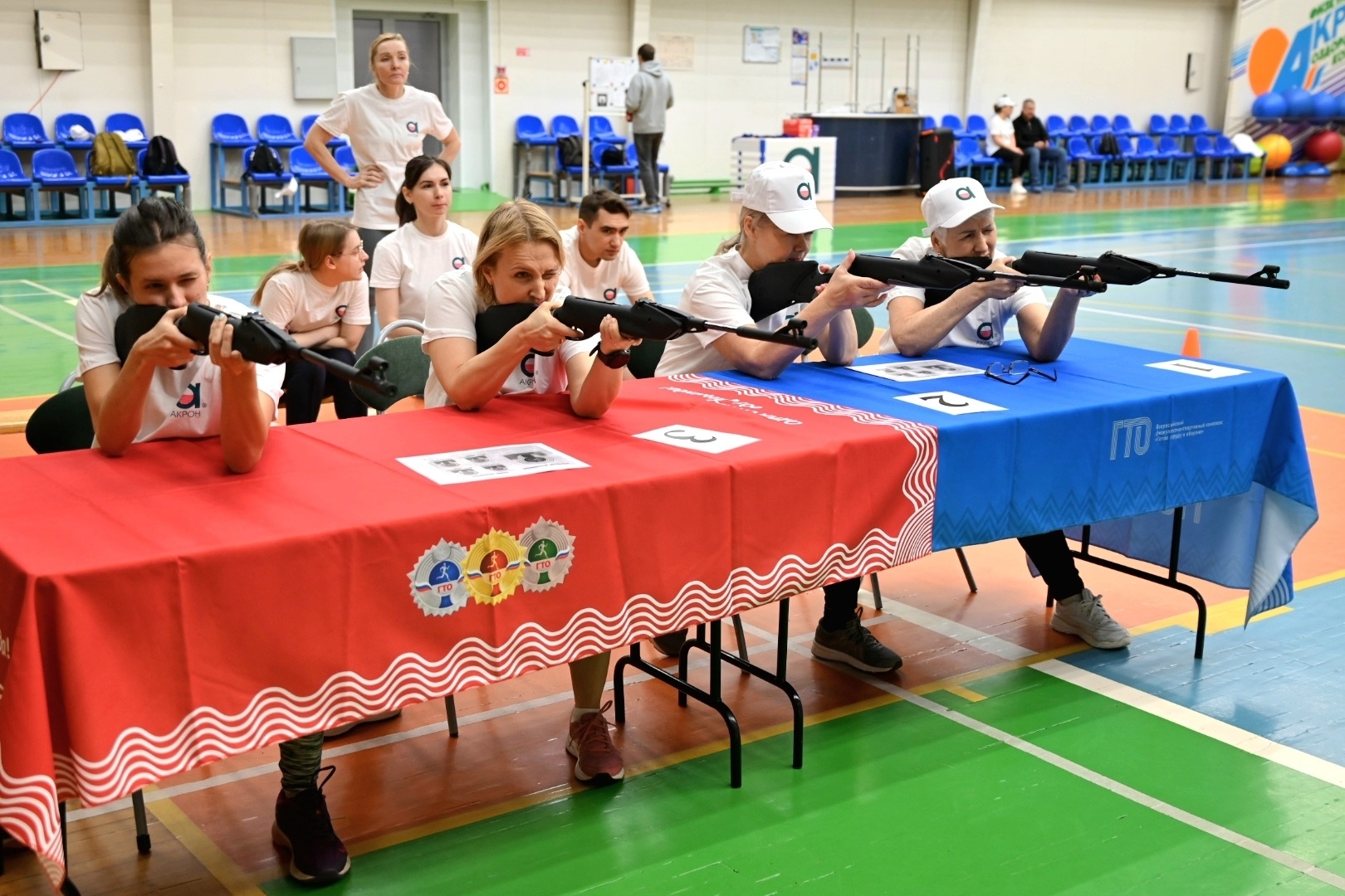 6 коллективов выполнили испытания по программе комплекса, включавшие поднимания туловища, наклоны вперед, отжимания, подтягивания, рывок гири, прыжки с места и стрельбу из электронного оружия.